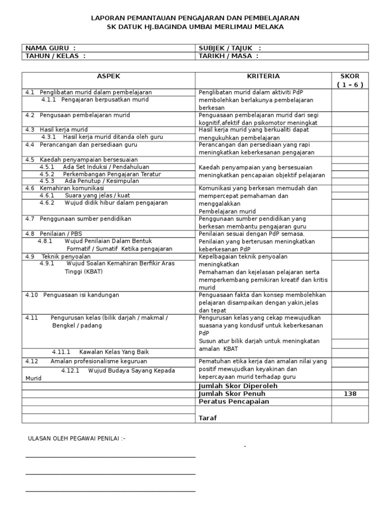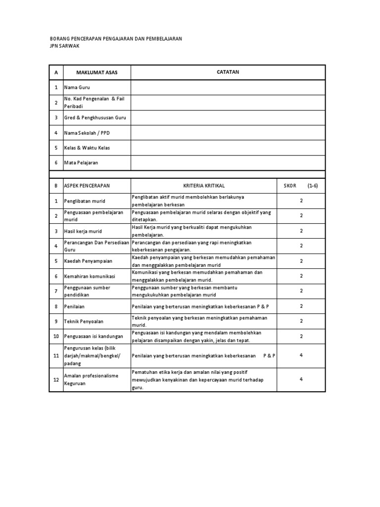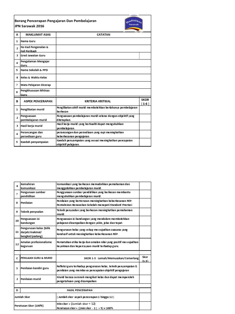 Borang Pencerapan Pengajaran Dan Pembelajaran Jpn Sarawak 2016