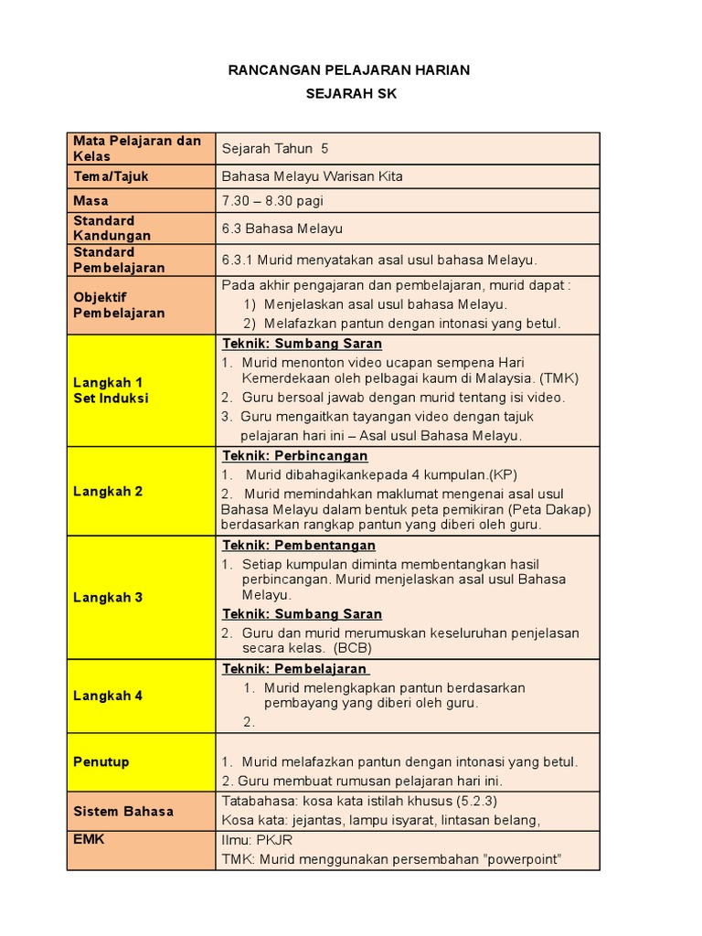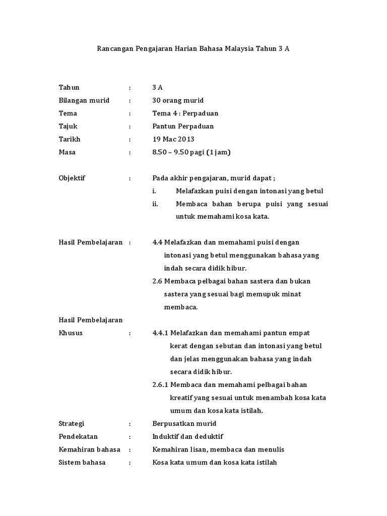 Rancangan Pengajaran Harian Bahasa Malaysia Tahun 3 A Docx