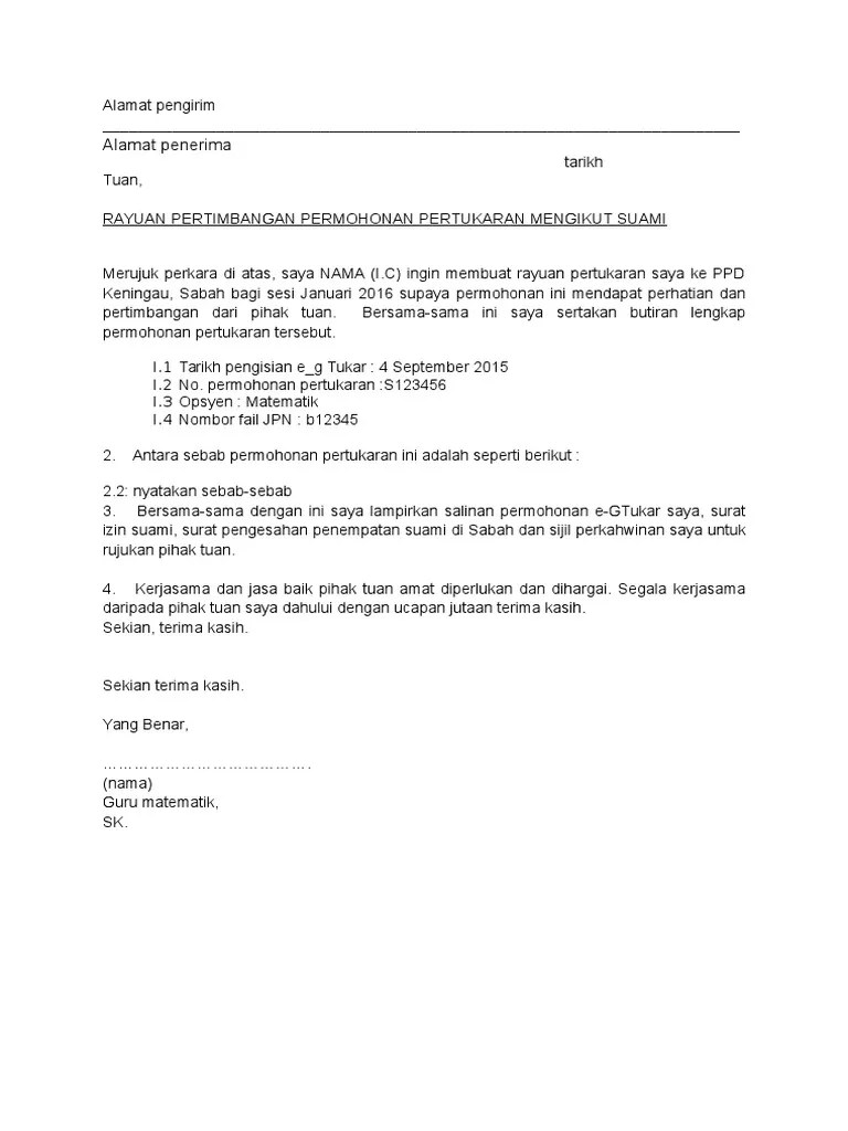 Surat Permohonan Tukar Sekolah J Kosong W