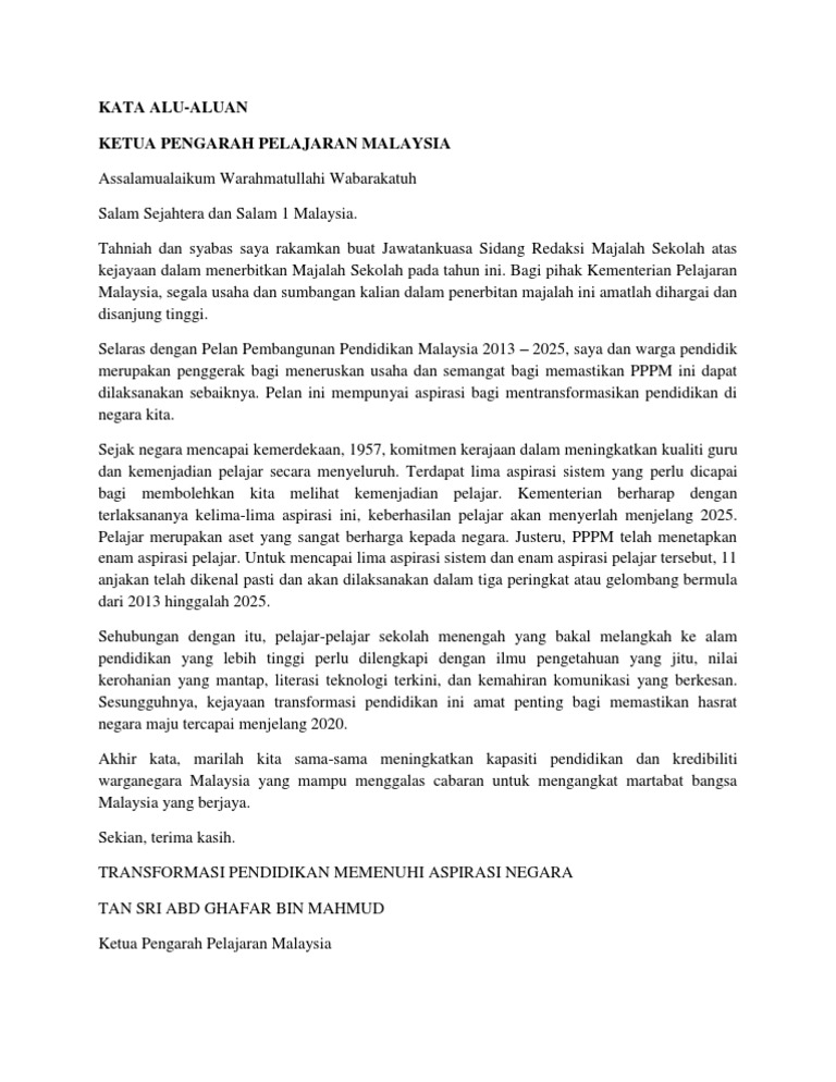 Kpm Kata Alu Aluan Majalah Sekolah Oleh Menteri Pendidikan Malaysia