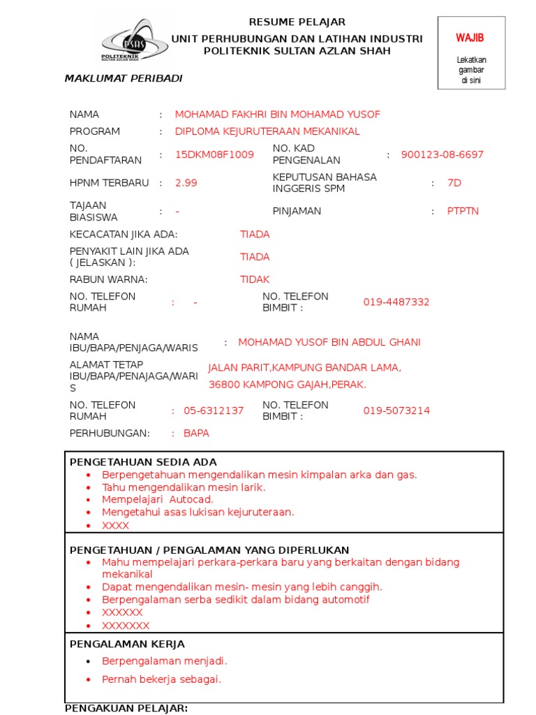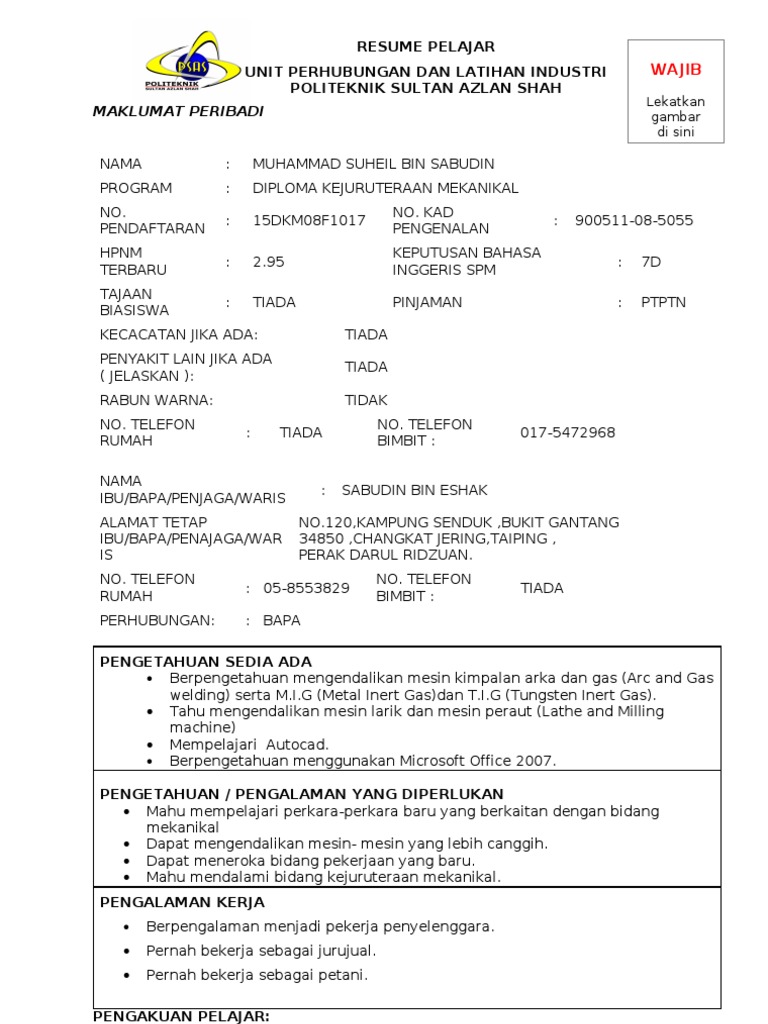 Resume Lengkap Untuk Memohon Kerja Pelajar Latihan Industri